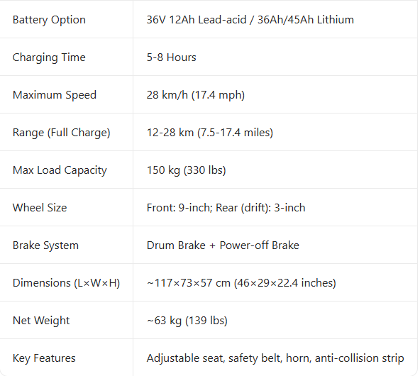 3.Comfort-Focused: Features a padded, contoured seat (with back support) for extended use, plus an ergonomic steering setup.